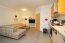 Die Ferienwohnung Q13 bietet ein gemütliche Schlafzimmer, ein einladendes Wohnzimmer mit integrierter Essecke sowie eine vollständig ausgestattete Einbauküche. Das moderne Badezimmer verfügt über eine ebenerdige Dusche zur Verfügung. Ausserhalb der Ferienwohnung gibt es einen Sitzbereich.